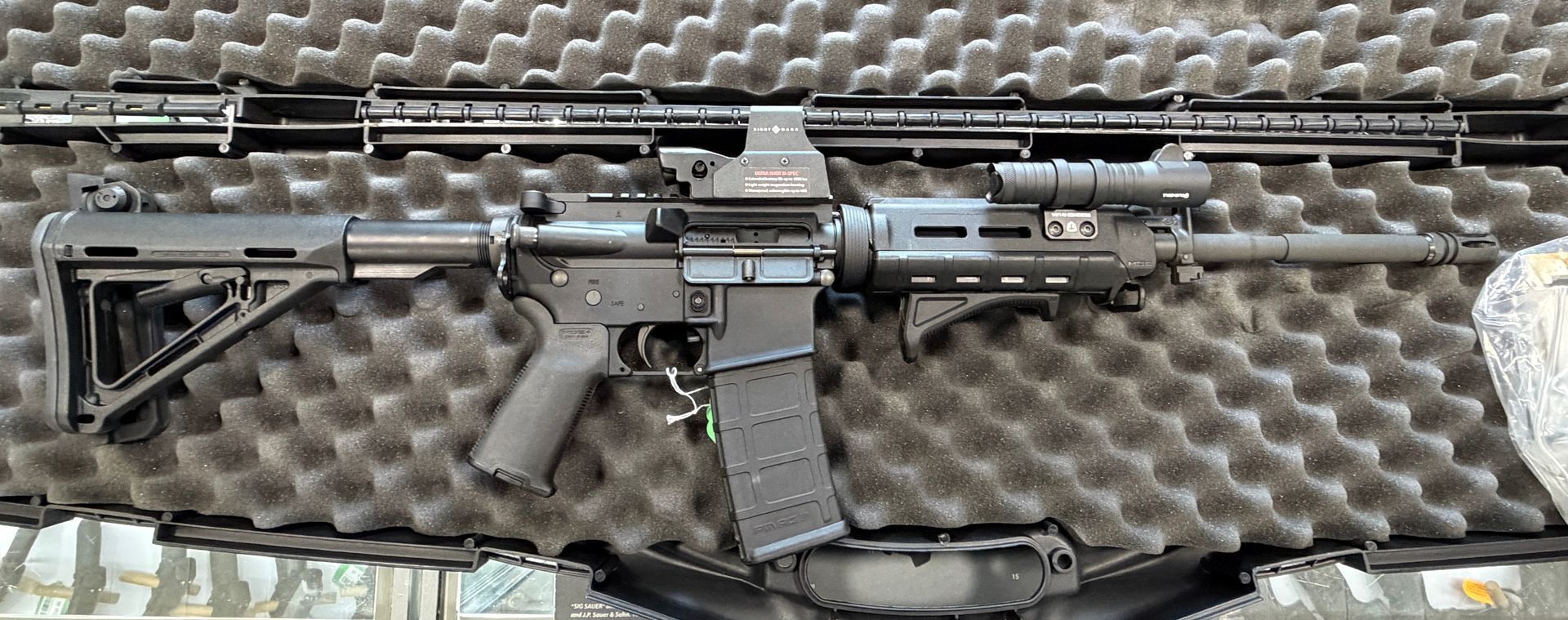 Preowned Bushmaster XM15-E2S in excellent condition. This one comes with a Sight Mark Sight, Flashlight, Magpul Furniture, detachable carry handle, one mag and hard case