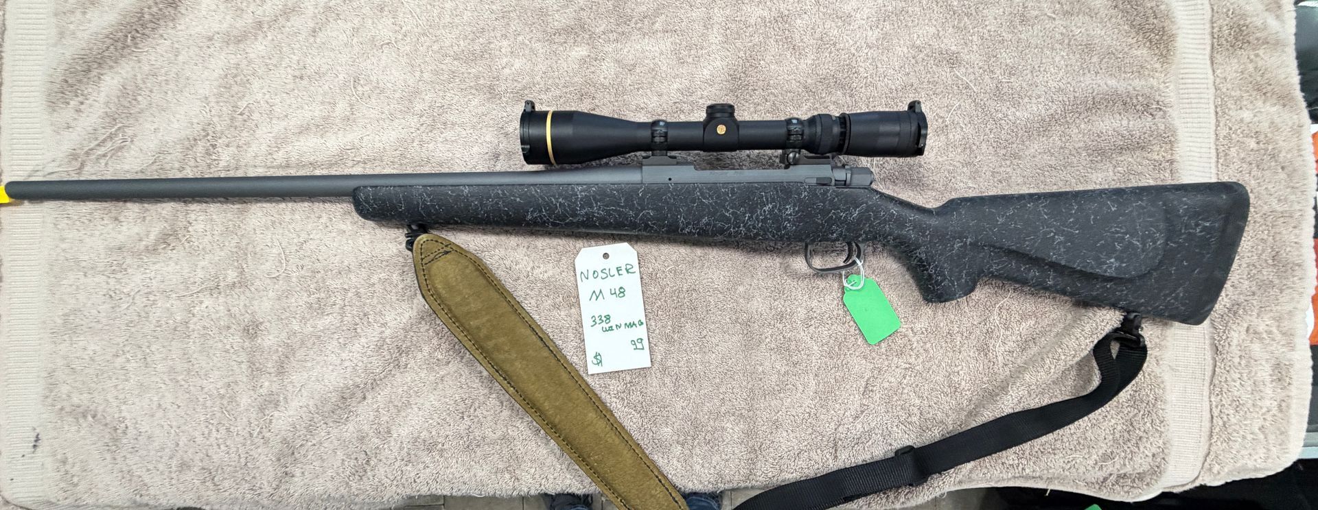 Preowned Nosler M48 Trophy Grade 338 Win Mag in Like New Condition. Comes with a Leupold VX3 Scope.