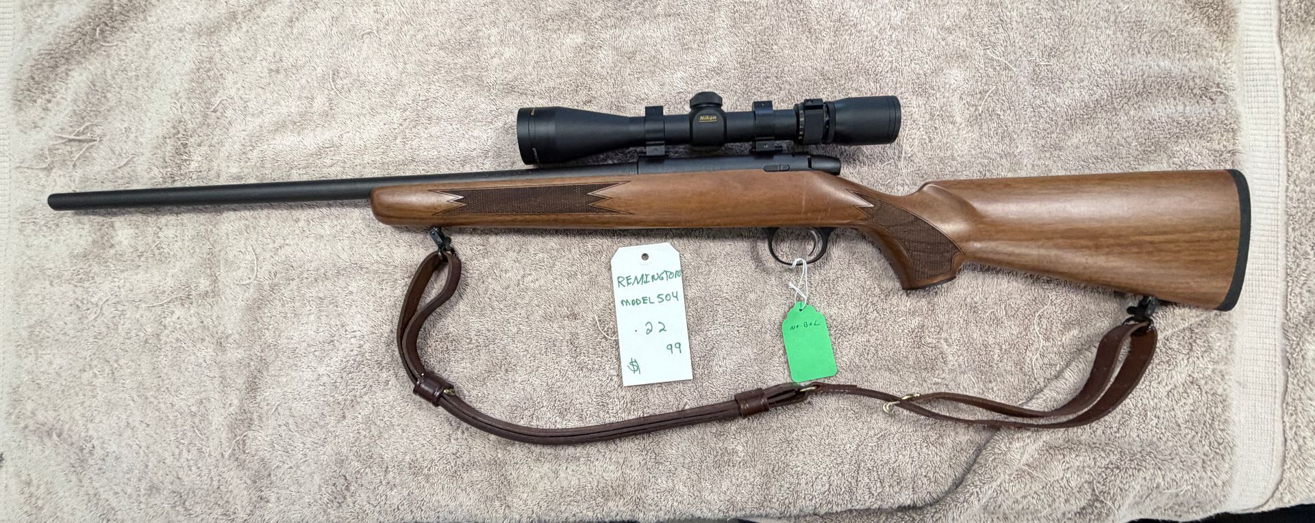 Preowned Remington Model 504 22LR Rifel in excellent condition. Comes with a Nikon Pro Staff Scope